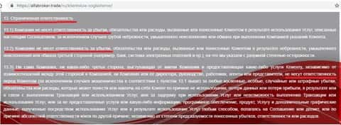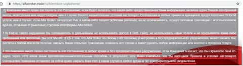 Договор, который Альфа Брокер заключает с клиентами, такое же кидалово, как и вся деятельность аферистов. Компания всегда остается невиновной в случае потери вкладчиком средств, так как мошенники включили в договор пункт об отсутствии ответственности.