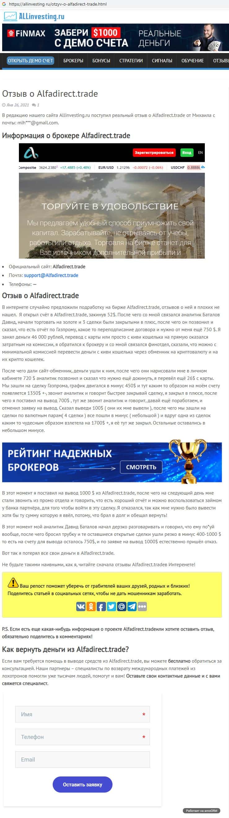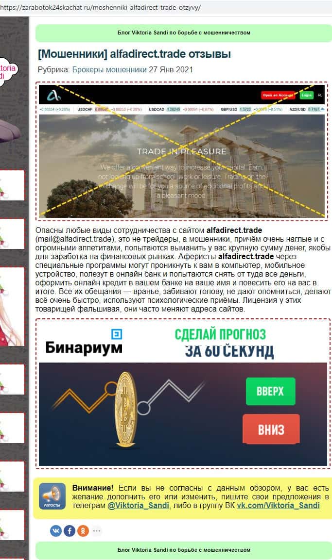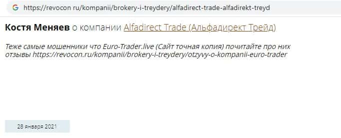 - Обзоры, разоблачающие фальшивую брокерскую структуру Альфа Директ Трейд, найденные в интернете
