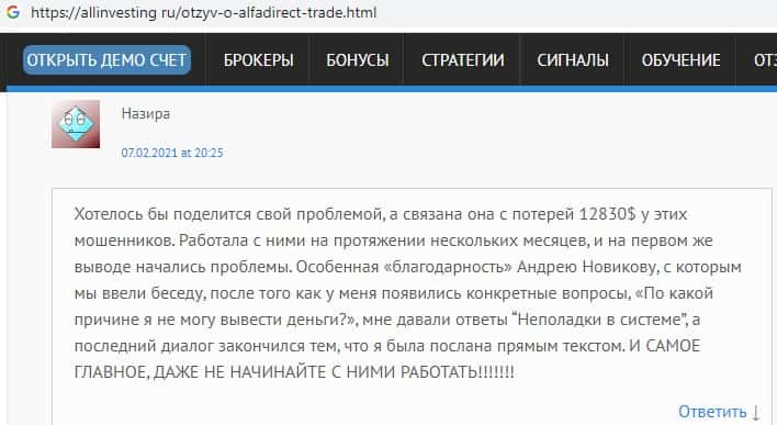 Обзоры, разоблачающие фальшивую брокерскую структуру Альфа Директ Трейд, найденные в интернете