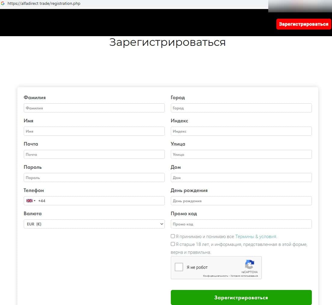 Также Альфа Директ Трейд использует форму для регистрации, в которую надо ввести фамилию, телефон и уйму всего. После этого нужно терпение, дабы не сойти с ума от звонков.