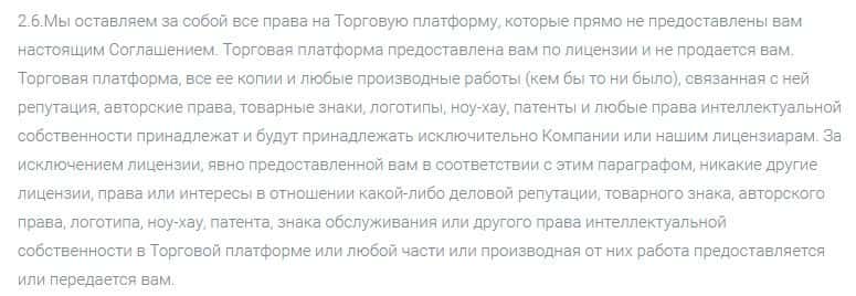 В пункте 2.12. договора говорится, что Альфа Директ Трейд не обязуется даже отвечать за постоянный и бесперебойный доступ клиентов к платформе, что может повлечь потерю денег.