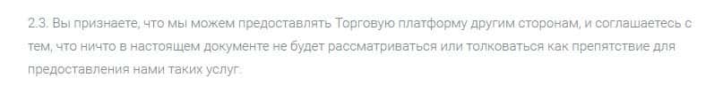 Пункт 2.3. договора гласит о том, что обманщики Альфа Директ Трейд вправе предоставлять торговую платформу другим сторонам, что небезопасно для самих трейдеров.