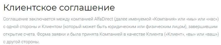 Клиентское соглашение плутовского дилингового центра Альфа Директ Трейд