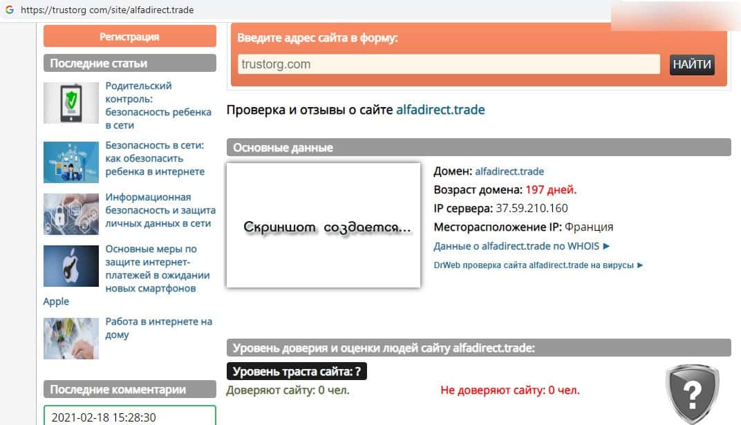 - Информация о фиктивном форекс брокере Альфа Директ Трейд на интернет-портале scamadviser com