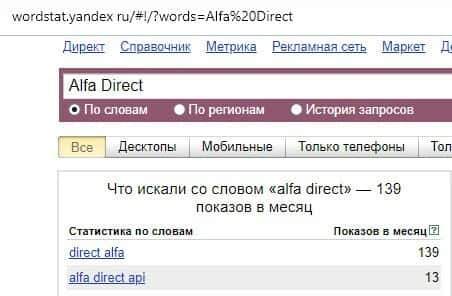 Количество запросов по брендовому названию "Alfa Direct", совершенного с пробелом на английском языке, по информации с сервиса wordstat yandex ru, равняется значению: 139 раз.