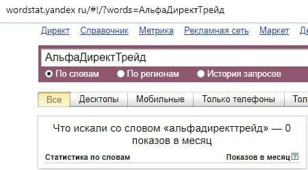 Количество запросов по брендовому имени "АльфаДиректТрейд", вбиваемого без пробелов на русском языке, совершенных в поисковой системе Яндекс, достигло 0 показов в месяц.