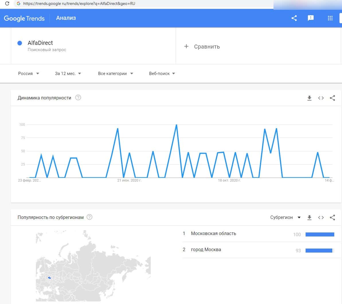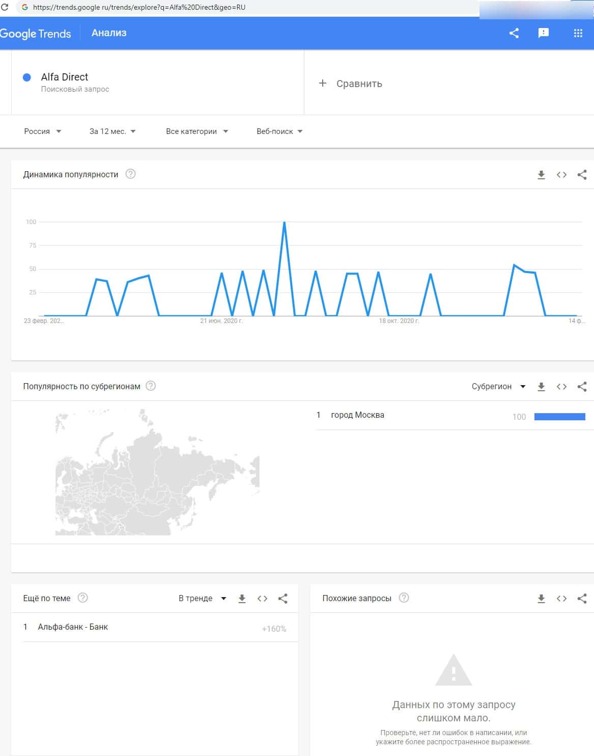 Согласно данным с интернет-портала trends google ru, бренд на английском языке "AlfaDirect" наиболее искомое было с 21 июня по 18 октября 2020 года на территории Москвы.