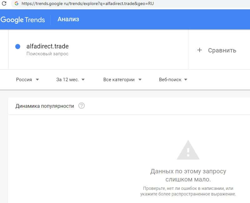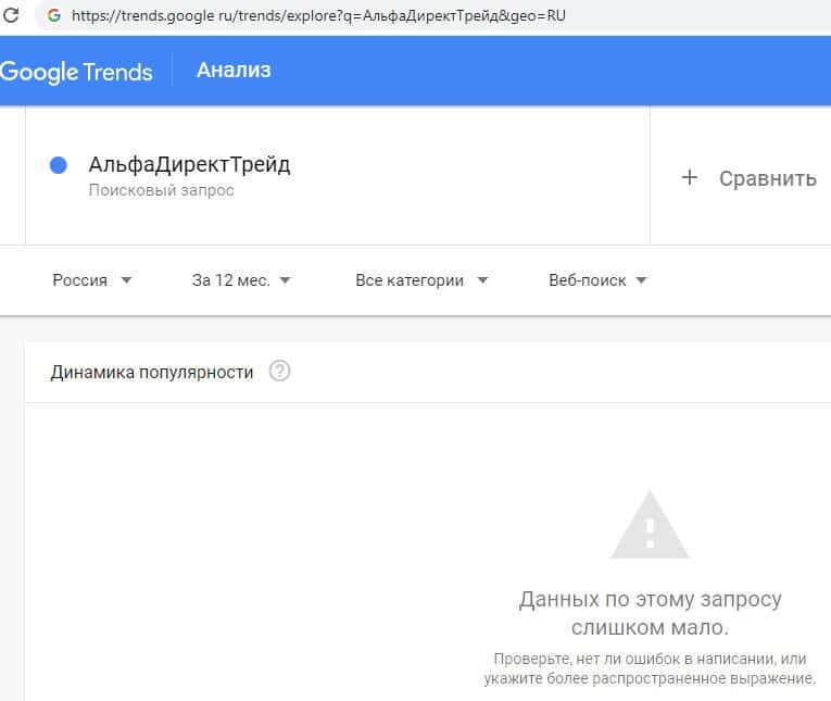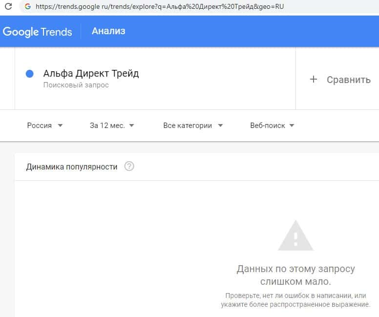 Далее попробуем совершить поиск в системе Гугл Трендс брендового имени на русском языке с двумя пробелами " Альфа Директ Трейд". Ответ такой же, слишком мало запросов.
