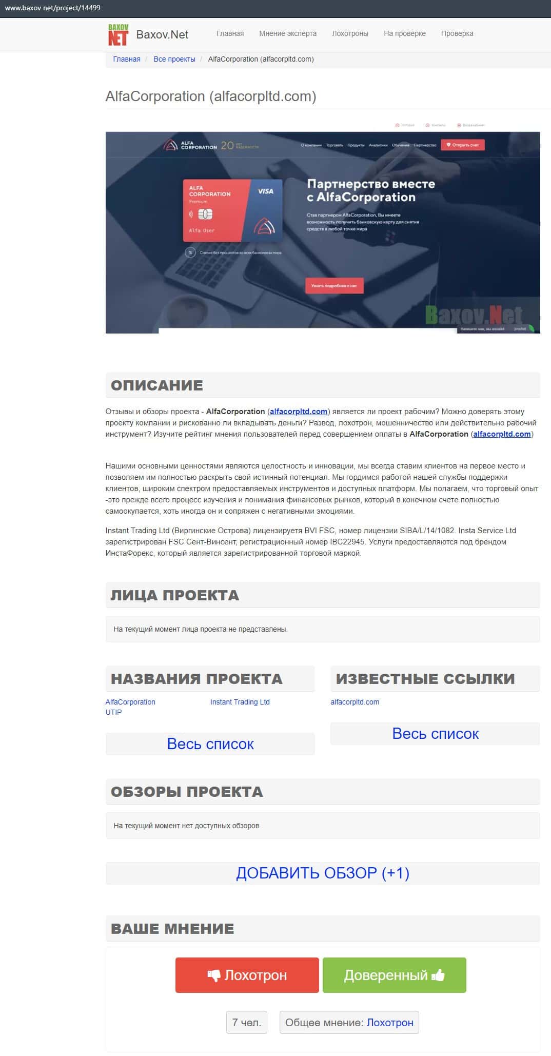 Далее представлена статья о мошеннической конторе Альфа Корпорэйшин, которая использует своих клиентов в качестве дойных коров, да и отзывы о них в основном негативные.