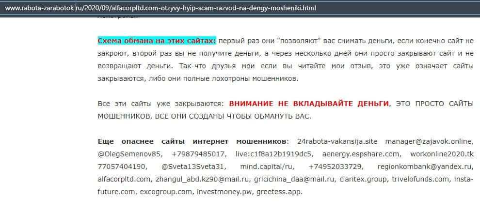 Мошенники AlfaCorpLTD попали в обзор одного сайта, где описывается, что это очередная шулерская компания, которая появилась недавно, но уже обворовала не мало людей.
