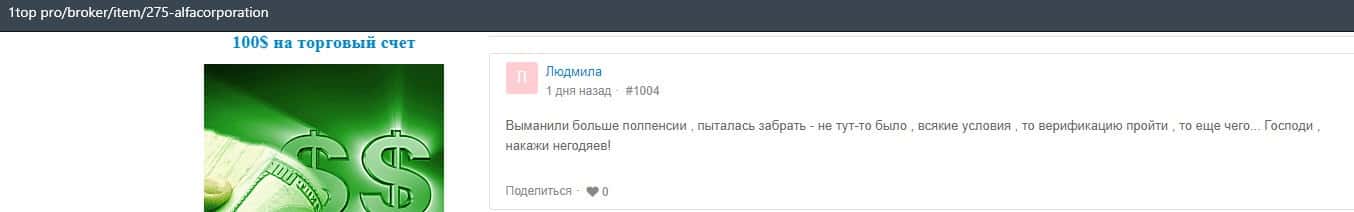 Отзывы о потере средств в конторе AlfaCorpLTD