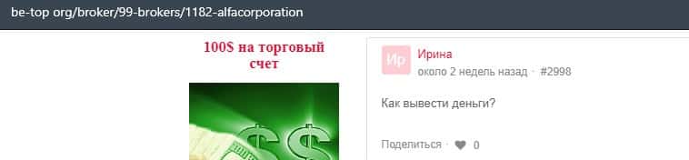 Женщина интересуется в своем отзыве, как же ей теперь вывести деньги с мошеннической конторы AlfaCorpLTD, где у нее открыт счет. Аферисты попросту не хотят выходить на связь.