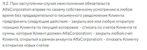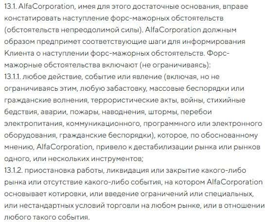 Если что, то брокерская афера Альфа Корпорэйшин может в любой момент списать все свои грехи на наступление форс-мажорных обстоятельств без предварительного уведомления.
