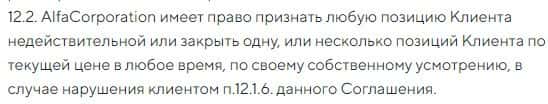 Брокерская кухня AlfaCorpLTD имеет право признать любую позицию клиента недействительной или закрыть все его позиции, без объяснения каких-либо причин.