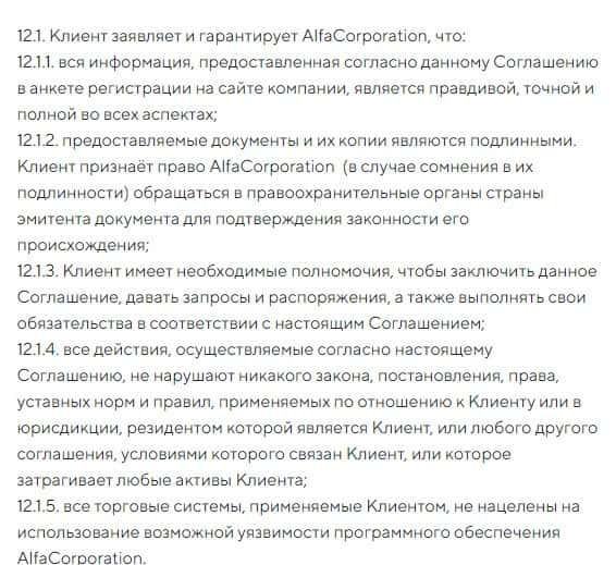 Также Альфа Корпорэйшин заставляют клиентов гарантировать что они не будут предъявлять никаких претензий к данной организации, за несоблюдение с их стороны правил.