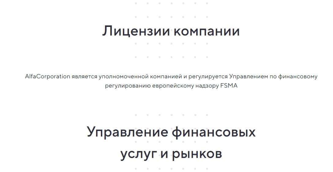 Что касается регуляции деятельности лохотрона Альфа Корпорэйшин так здесь есть упоминание Управления по финансовому надзору FSMA, но подтвердить это они не могут.