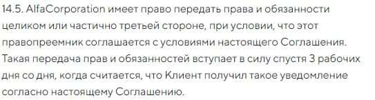 Лохотрон AlfaCorpLTD имеет полномочия передавать права и обязанности целиком или частично третьей стороне, причем ответственности за это они нести не будут.