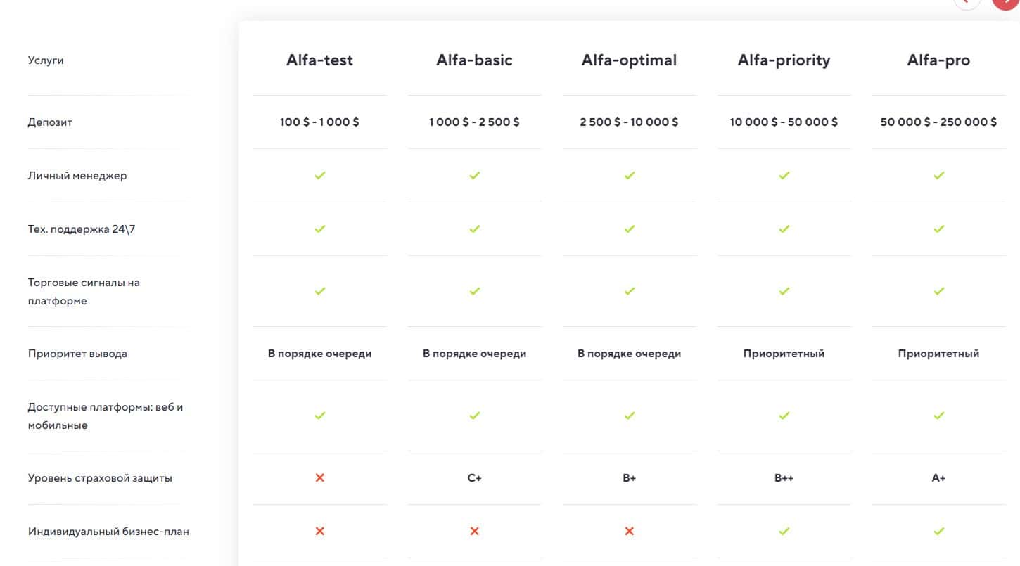Далее представлена градация торговых счетов, которые AlfaCorpLTD предлагает своим клиентам. Начинается со 100 долларов, хотя реальный Форекс стартует со 100 000 долларов.
