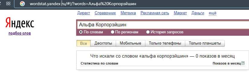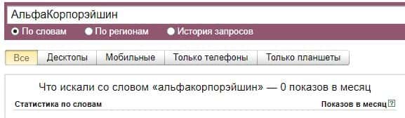 Следующим вариантом, мы решили пробить информацию бренда "АльфаКорпорэйшин" и, согласно Яндекс, запросов нет вообще, как и с предыдущим вариантом.