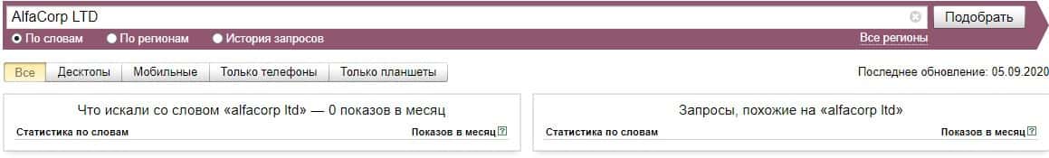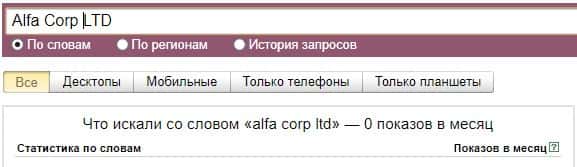 Та же самая ситуация и с брендом "Alfa Corp LTD". Мошенники не набрали популярности в поисковой системе Яндекс, поэтому и горит нулевой результат.