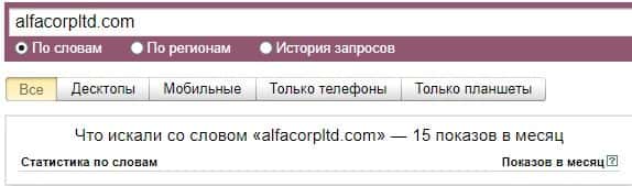 Далее мы решили проверить англоязычную версию бренда "AlfaCorpLTD" по Яндекс Вордстат и оказалось всего 15 показов за последний месяц.