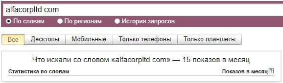 Если ввести бренд в виде официального сайта конторы без точки "alfacorpltd com", то поисковая система Яндекс выдает 15 показов за месяц.