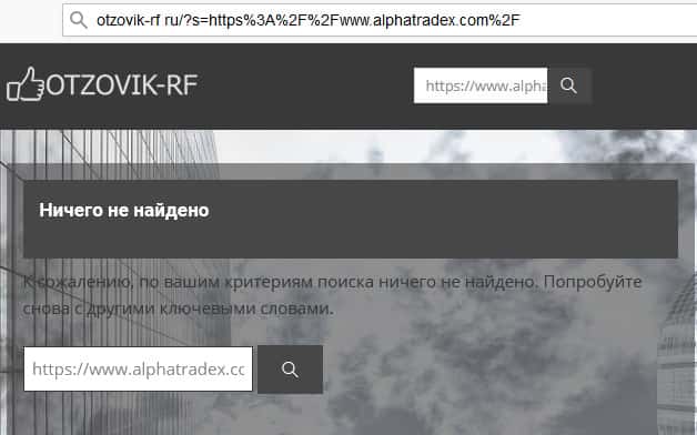 Если просмотреть все известные сайты-отзовики в интернете, то с удивлением обнаружишь, что о конторе Альфа Трейдекс нет никаких отзывов реальных людей. А это значит, что лохотрон регулярно их чистит о себе. Уже один этот факт должен вас насторожить, чтобы с ними не работать.