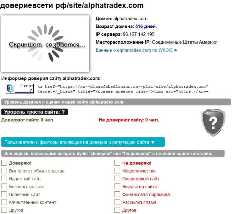 Есть такой известный ресурс в сети, как довериевсети рф. Так вот на нем можно делать очень удобный обзор таких лохотронов, как Alpha Tradex. Так вот на этот сайте нет вообще оценок ни одного человека о лохотроне. Значит и тут они их тоже подчистили. есть чего опасаться.