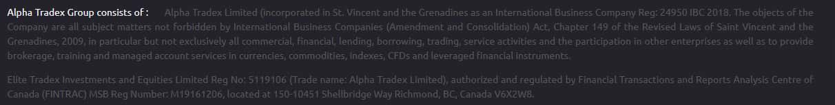 Сами жулики Alpha Tradex указывают на сайте, что они зарегистрированы в Сент Винсенте и Гренадина, но на деле даже это оказывается ложью, потому что они не показывают на сайте этой самой лицензии. И это если учесть, что регистрация в таком месте, мягко говоря, не придает уверенности клиенту и имиджу компании. Причем любой. Это не говоря о том, что на территории СНГ они вообще фактически незаконно работают.