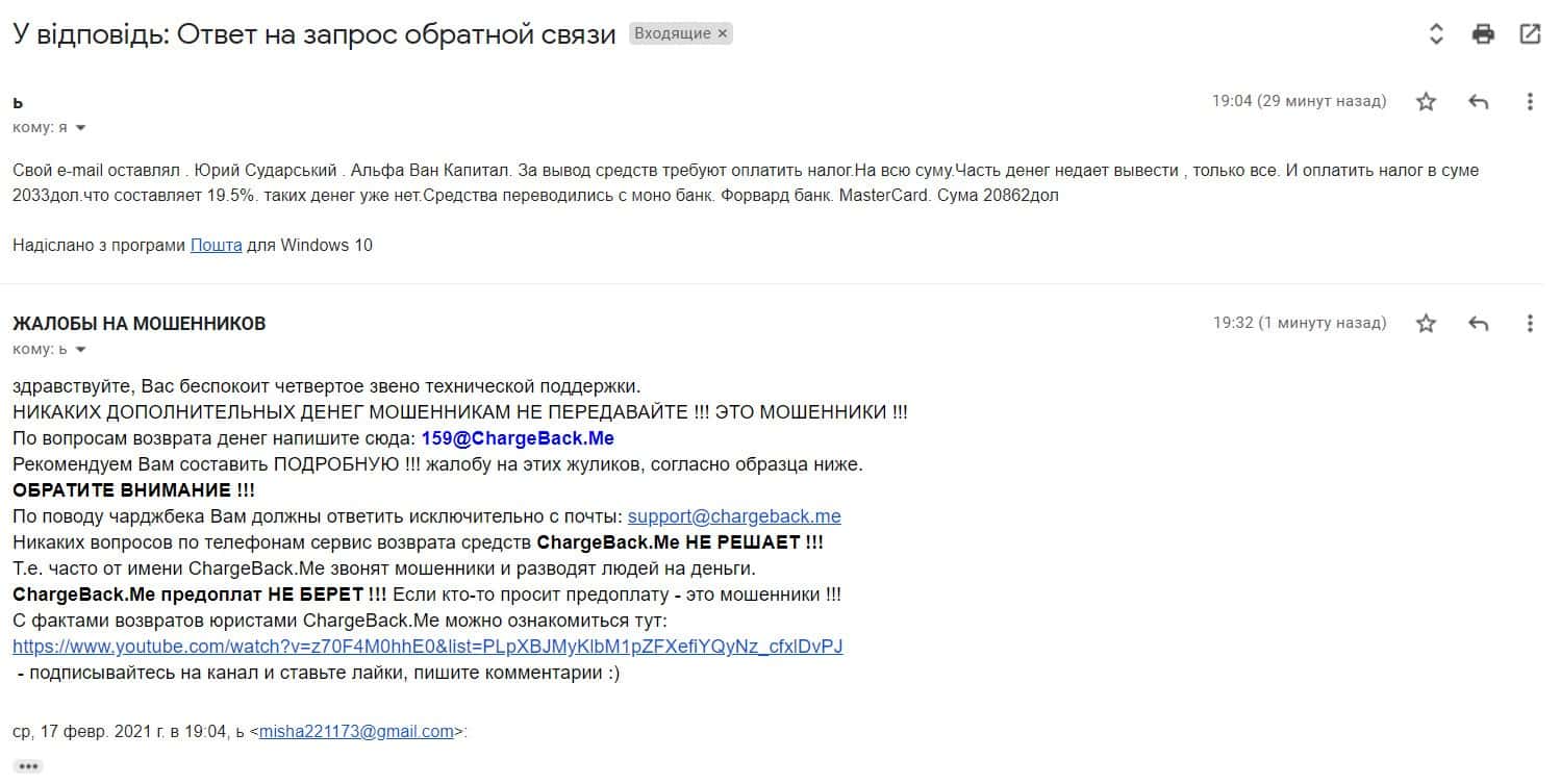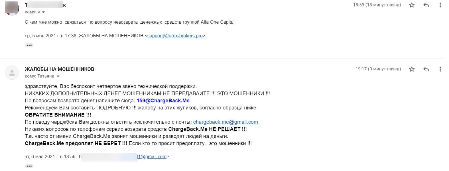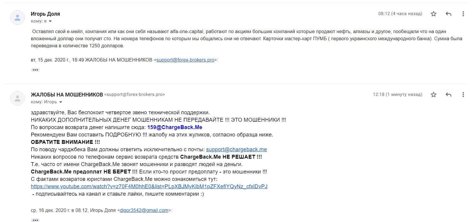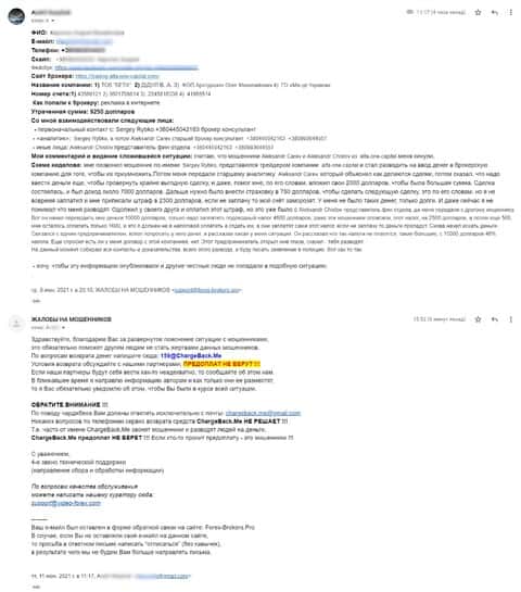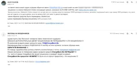 Далее предоставлена жалоба на мошенников Альфа Ван Капитал, которые кинули клиента на 9250 долларов США, заставляя оплатить налог.