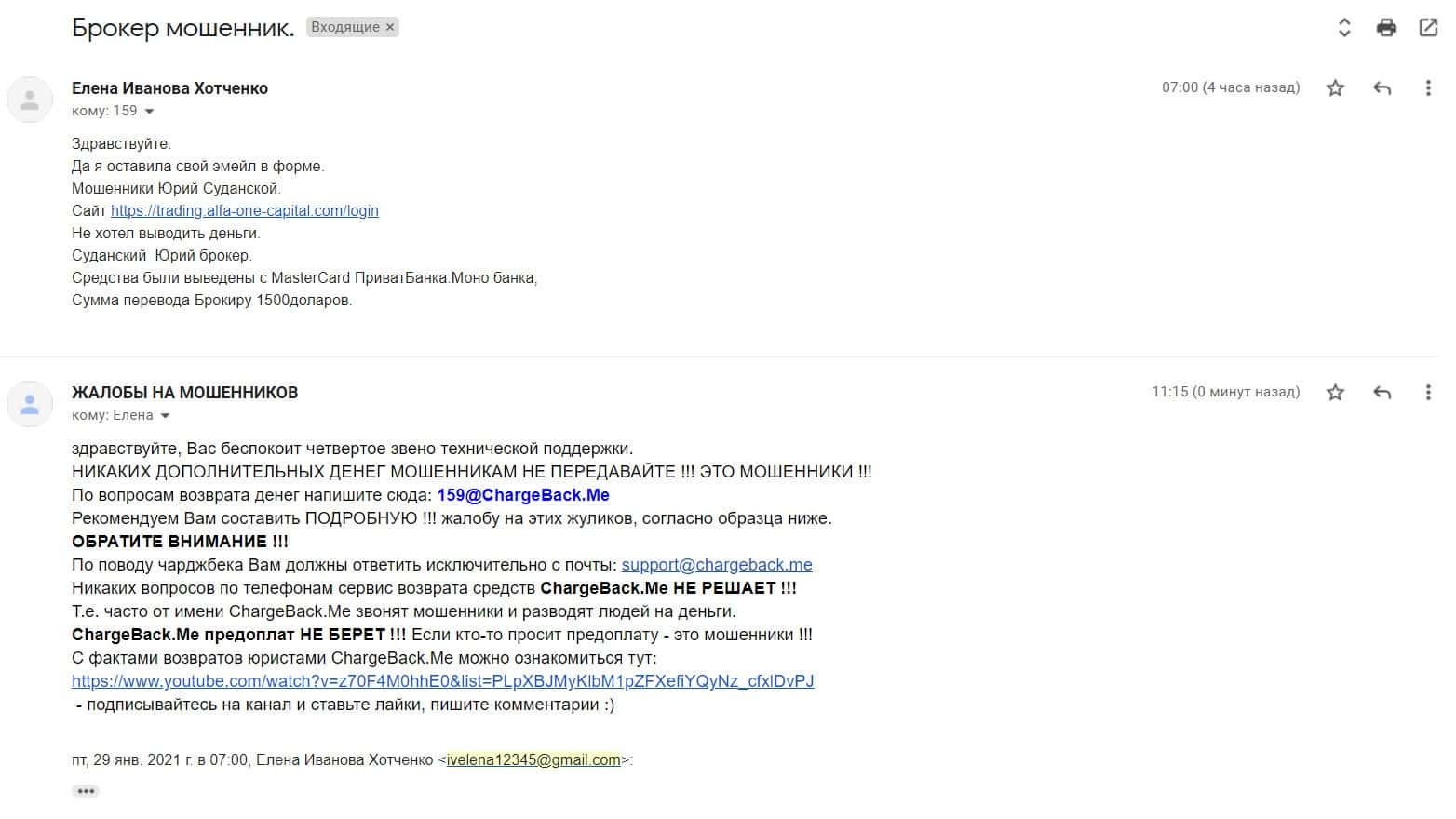 Ниже предоставлена жалоба на мошенническую организацию Alfa One Capital, которая не вывела денежные средства своему клиенту.