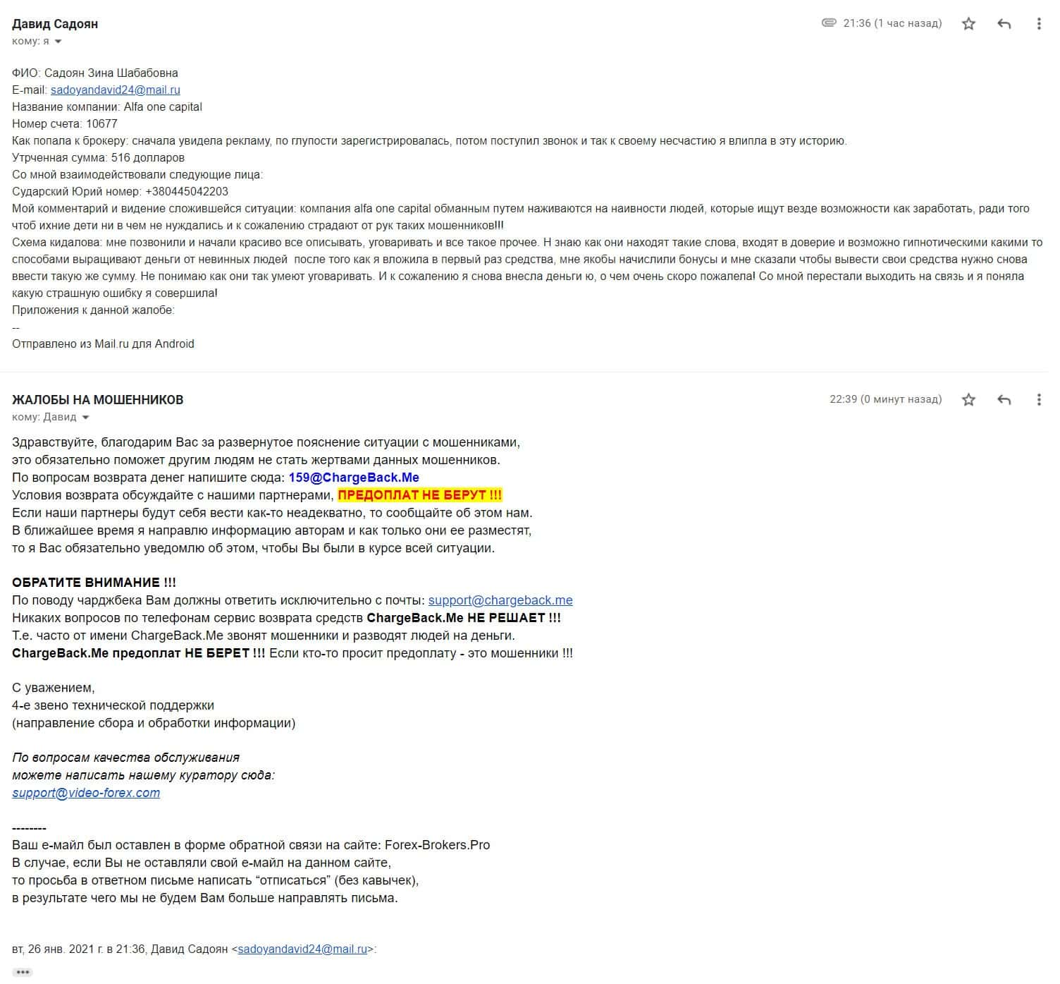 В данном разделе предлагаем увидеть информационный материал в виде жалобы на мошенническую компанию Альфа Ван Капитал, которая развела клиента на 20 862 $ США.