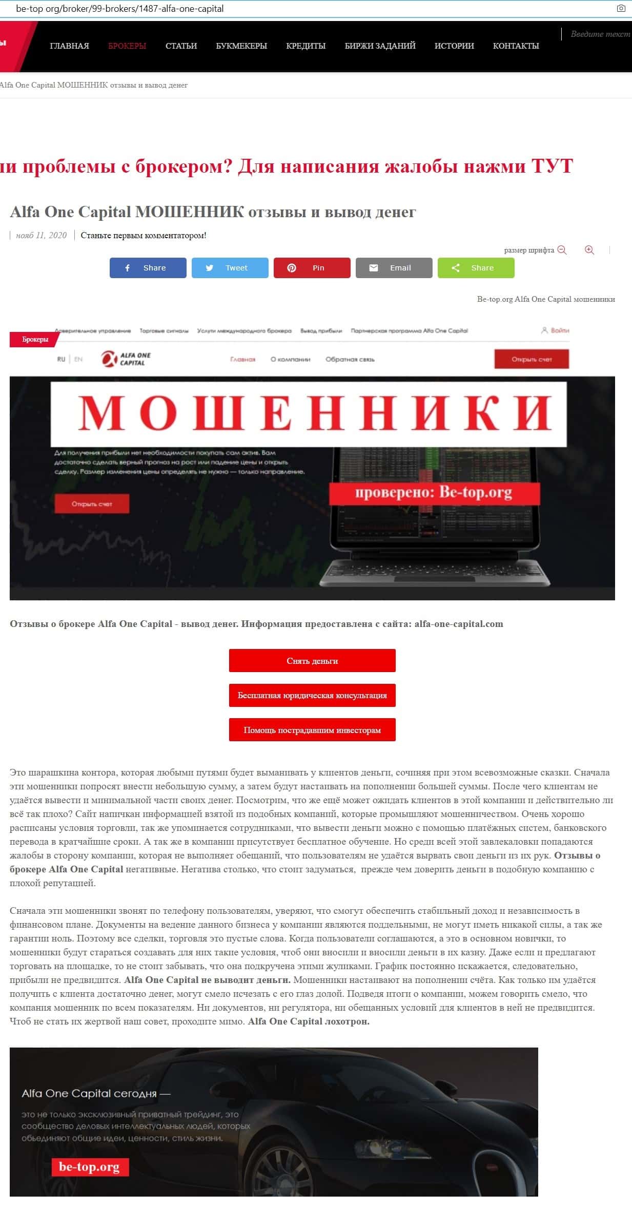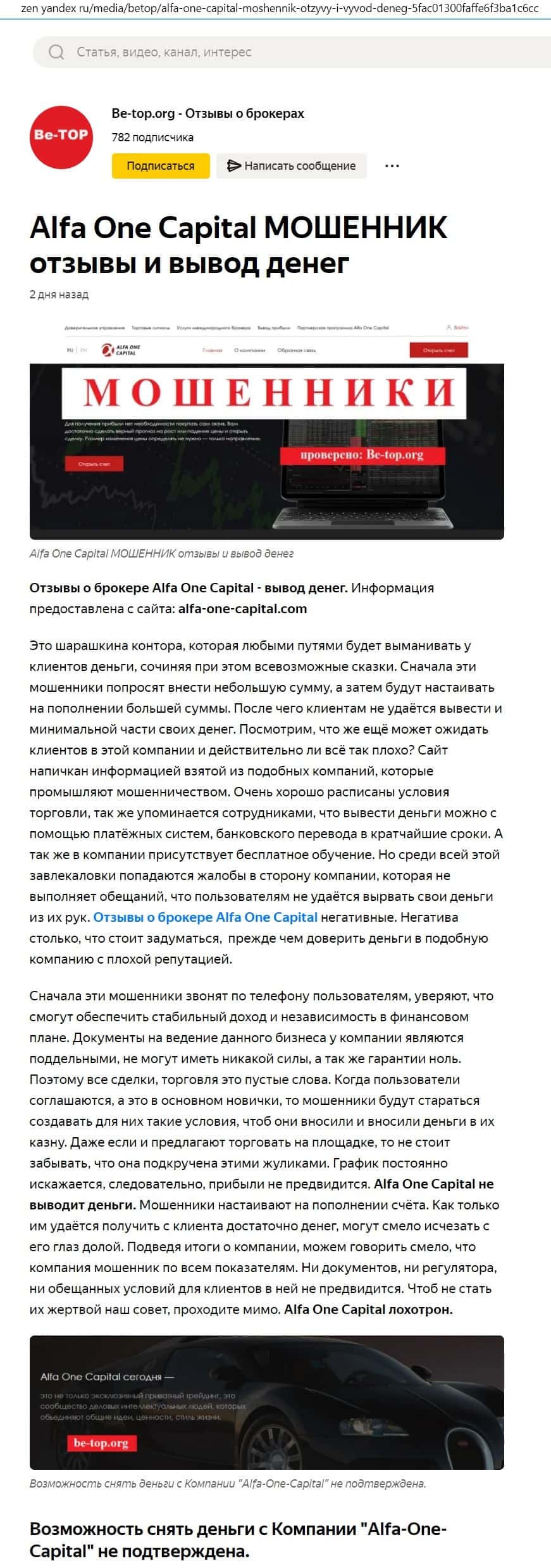 Авторы статьи на сайте be-top org пишут, что мошенники Alfa One Capital не выводят деньги, поэтому работать с ними крайне опасно, связываться не стоит.