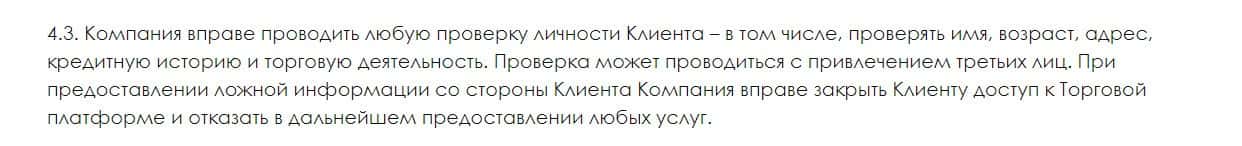 Пункт 4.3 договора компании Alfa One Capital уведомляет о том, что администрация будет проводить проверки клиента и может ограничить доступ к платформе на это время.