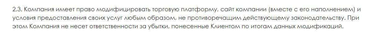 В пункте 2.3 контора Alfa One Capital заявляет, что может модифицировать свой сайт, когда захочет, и не несет ответственности за убытки клиентов, связанные с этим процессом.