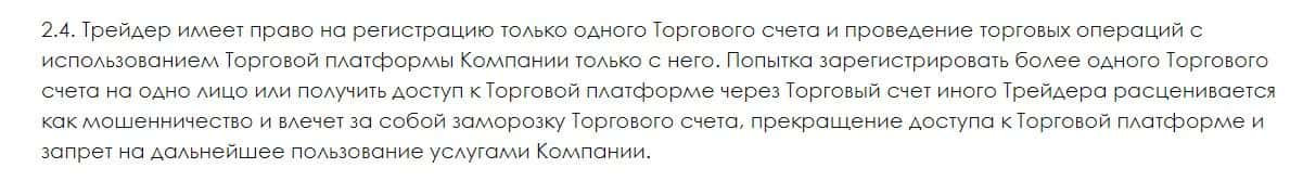 Следующий пункт договора говорит о том, что мошенники Alfa One Capital заблокируют пользователя, если увидят, что он зарегистрировал более одного аккаунта.