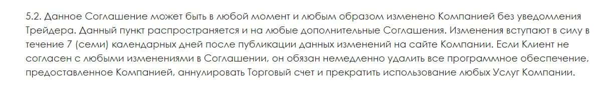 В пункте 5.2 контора Alfa One Capital предупреждает пользователей, что может вносить изменения в данный договор без уведомления об этом.