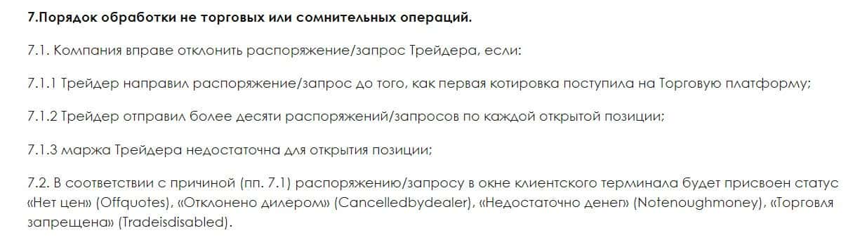 В седьмом разделе настоящего договора клиент может прочитать правила обработки сомнительных и не торговых операций.