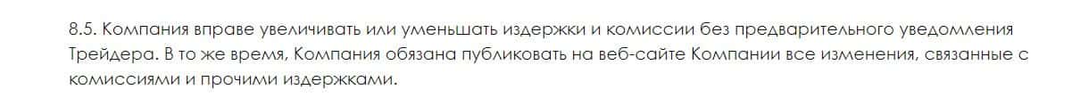 Пункт 8.5 рассказывает о том, что контора Alfa One Capital имеет право увеличивать комиссии и другие расходы без уведомления об этом клиента.