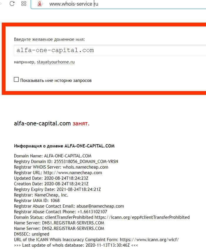 Кому принадлежит доменное имя сайта alfa-one-capital com?
