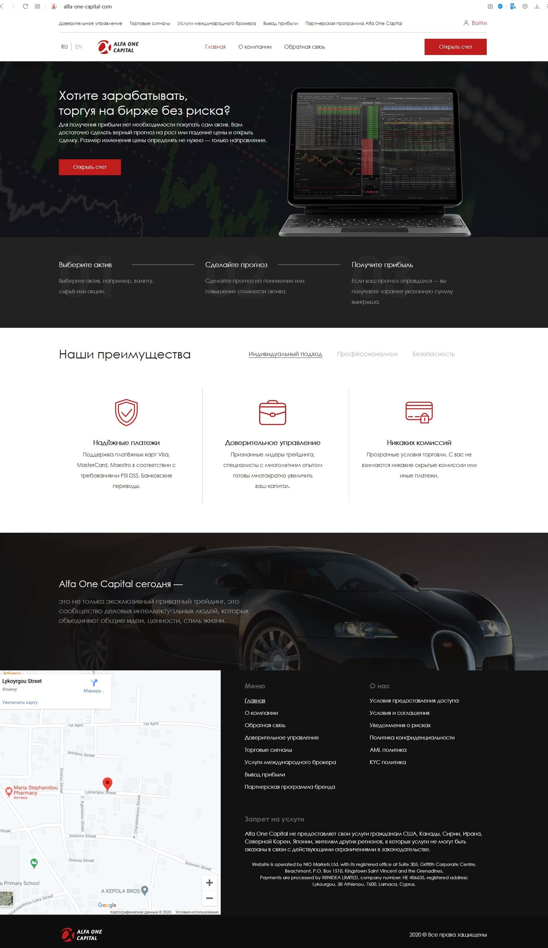 Судя по информации на сайте Alfa One Capital, их офис располагается на островах Сент-Винсент и Гренадины. Это известный офшор, где регистрируются жулики и аферисты.