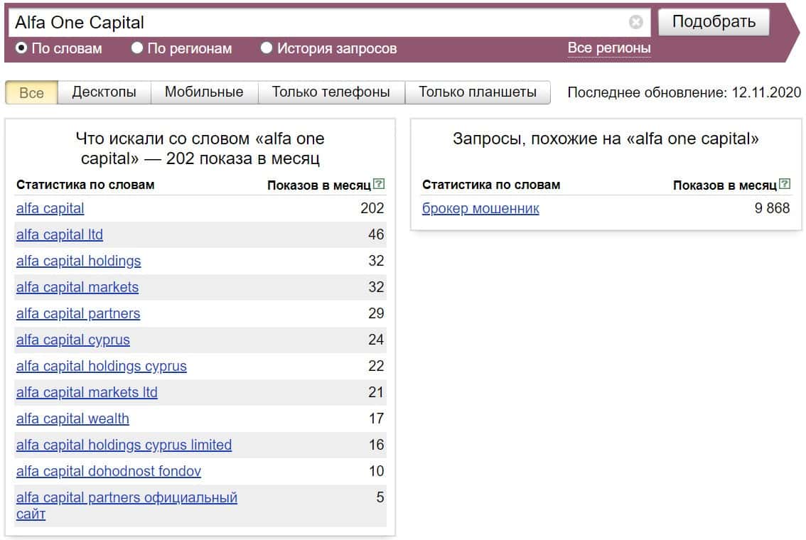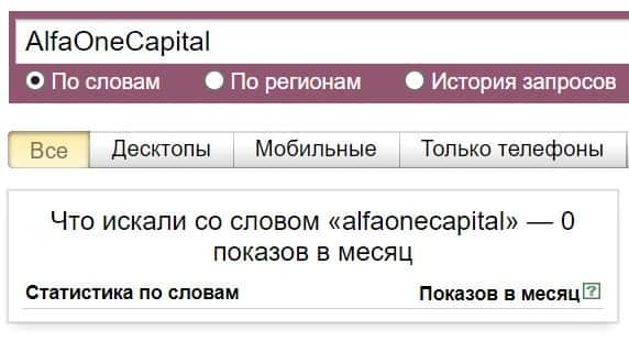 Название мошеннической конторы "AlfaOneCapital", написанное на английском языке, пользователи не искали в системе Яндекс ни одного раза за месяц.
