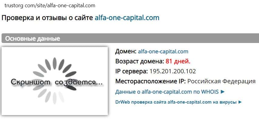 Возраст доменного имени сайта alfa-one-capital com, судя по данным сервиса Трасторг, составляет 81 день. Это свежеиспеченный лохотрон, которому всего три месяца.