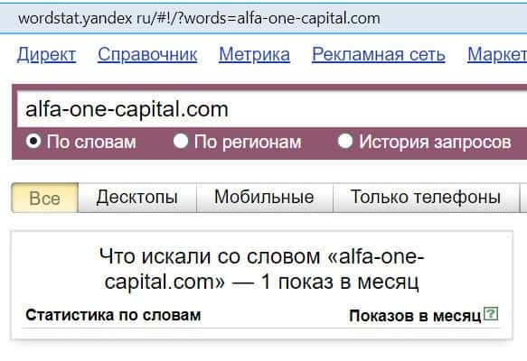В поисковой системе Яндекс доменное имя сайта "alfa-one-capital.com", вбитый в строку с точкой, пользователи искали 1 раз за месяц.