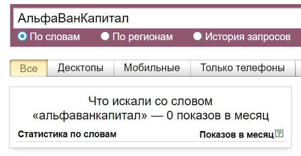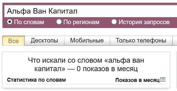 Посмотрим, сколько раз люди искали название бренда "Альфа Ван Капитал" на русском языке с пробелами: 0 раз за месяц.