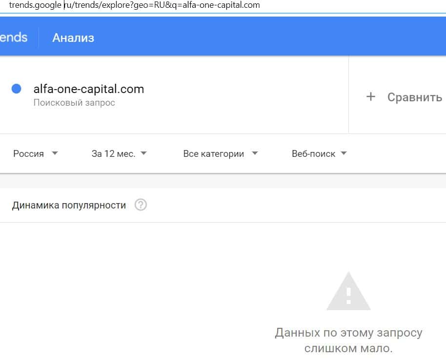 Доменное имя мошеннического сайта "alfa-one-capital.com" пользователи вбивали в поисковую систему Гугл слишком редко, поэтому данных по этому запросу очень мало.