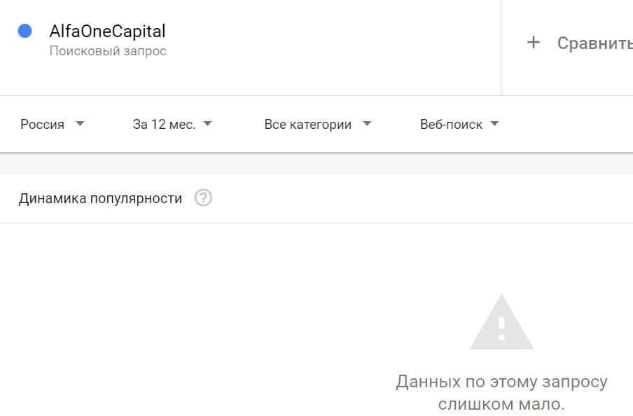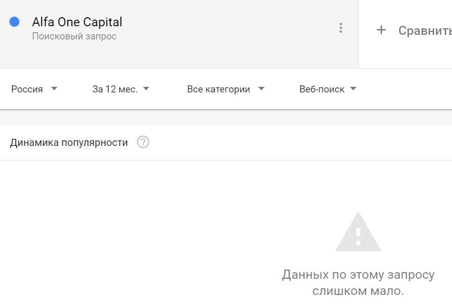 Посмотрим, насколько популярно название бренда "AlfaOneCapital", написанное на английском языке. Данных по этому запросу нет, так как никто не искал этот бренд в Гугл.