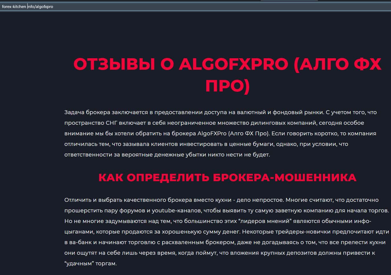 Далее представлена одна статья, в которой подозревается, что контора Алго ФХ Про является мошеннической и уже успела в свой-псевдо-проект затащить не мало жертв.