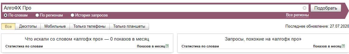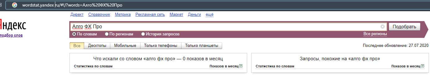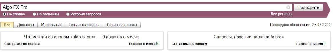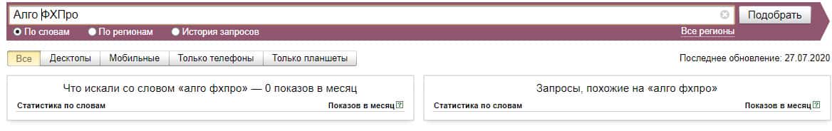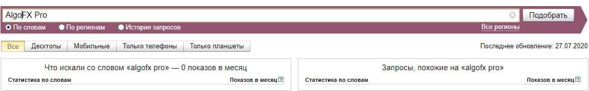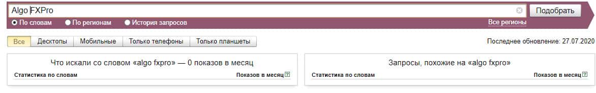 Если рассмотреть эту вариацию бренда "АлгоФХПро" по системе Яндекс Вордстат, то здесь нет никаких данных и значение показов за месяц равняются нулю.