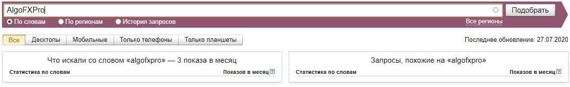Что касается англоязычной версии бренда "AlgoFXPro", то здесь есть кое-какие запросы в размере 3 показов за месяц и нужно понимать, что некоторые люди таки клюнули на это.